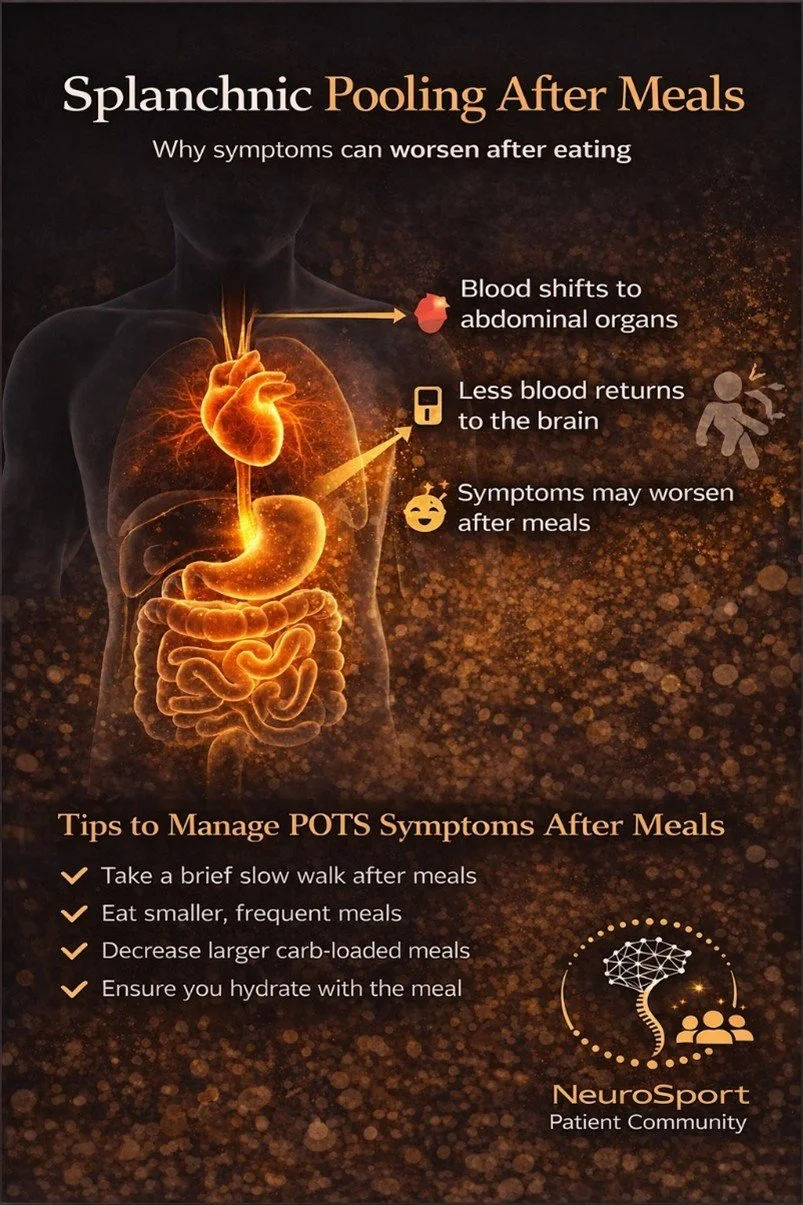 In dysautonomia, eating creates a shift in blood flow to the digestive system, reduces blood delivery to the brain, and can trigger rapid changes in blood sugar. Together, these effects place additional stress on an already unstable autonomic nervous system.